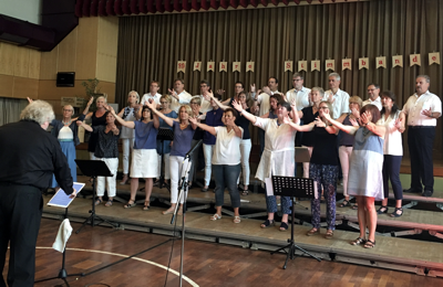 Aus dem „Kleinen Chor“, wie er anfangs hieß und der auf keinen Fall öffentlich auftreten wollte, ist inzwischen die gut 30-köpfige „Stimmbande“ geworden – eine kleine Erfolgsgeschichte für den freien Nusslocher Chor. Am Samstag stellte die fröhliche Truppe unter ihrem Leiter Michael Leibfried das Beste aus 20 Jahren Stimmbande in der Nusslocher Festhalle vor. 150 Freunde, Verwandte und Musikbegeisterte waren gekommen; und sie spendeten eifrig Beifall. Als Sabine Dumat-Gehrlein, die charmant und wortreich durchs Programm führte, das letzte Lied ankündigte – „I leave with a song“ ‒, ging ein deutliches „Och, schade“ durchs Publikum.