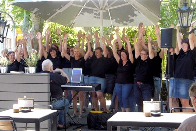 Mit diesem Programm konnten wir einen Teil der großen Bandbreite unseres Chores zeigen. Die Begeisterung, die bei den Café-Gästen trotz des betriebsamen, heißen und lauten Auftrittsortes aufkam, und der große Applaus gaben uns eine eindrucksvolle Rückmeldung für unsere Darbietung. Herzlichen Dank dafür!